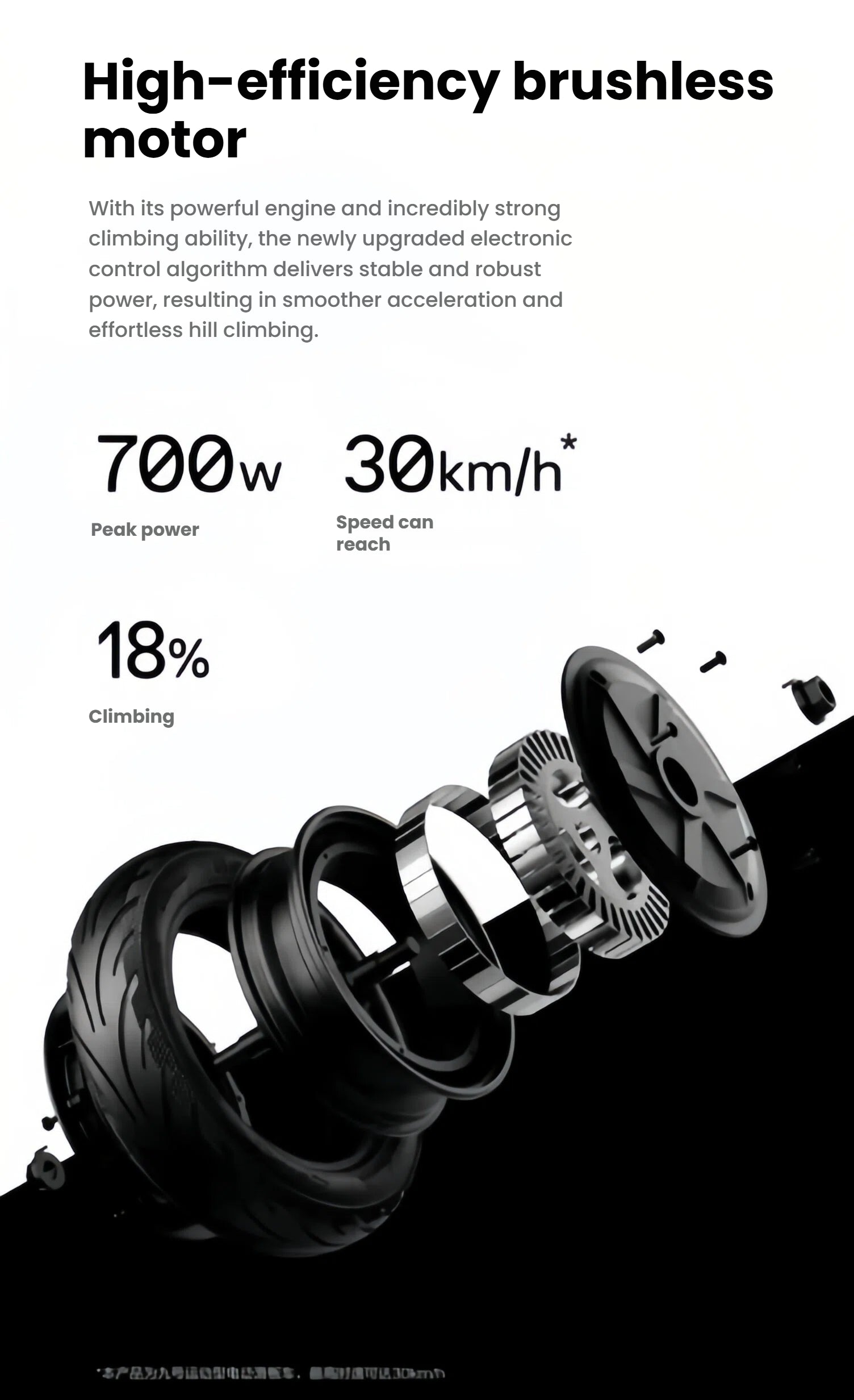Upgraded Motor Power: A 700W max output motor delivers a top speed of 18 mph and handles slopes up to an 18% grade.