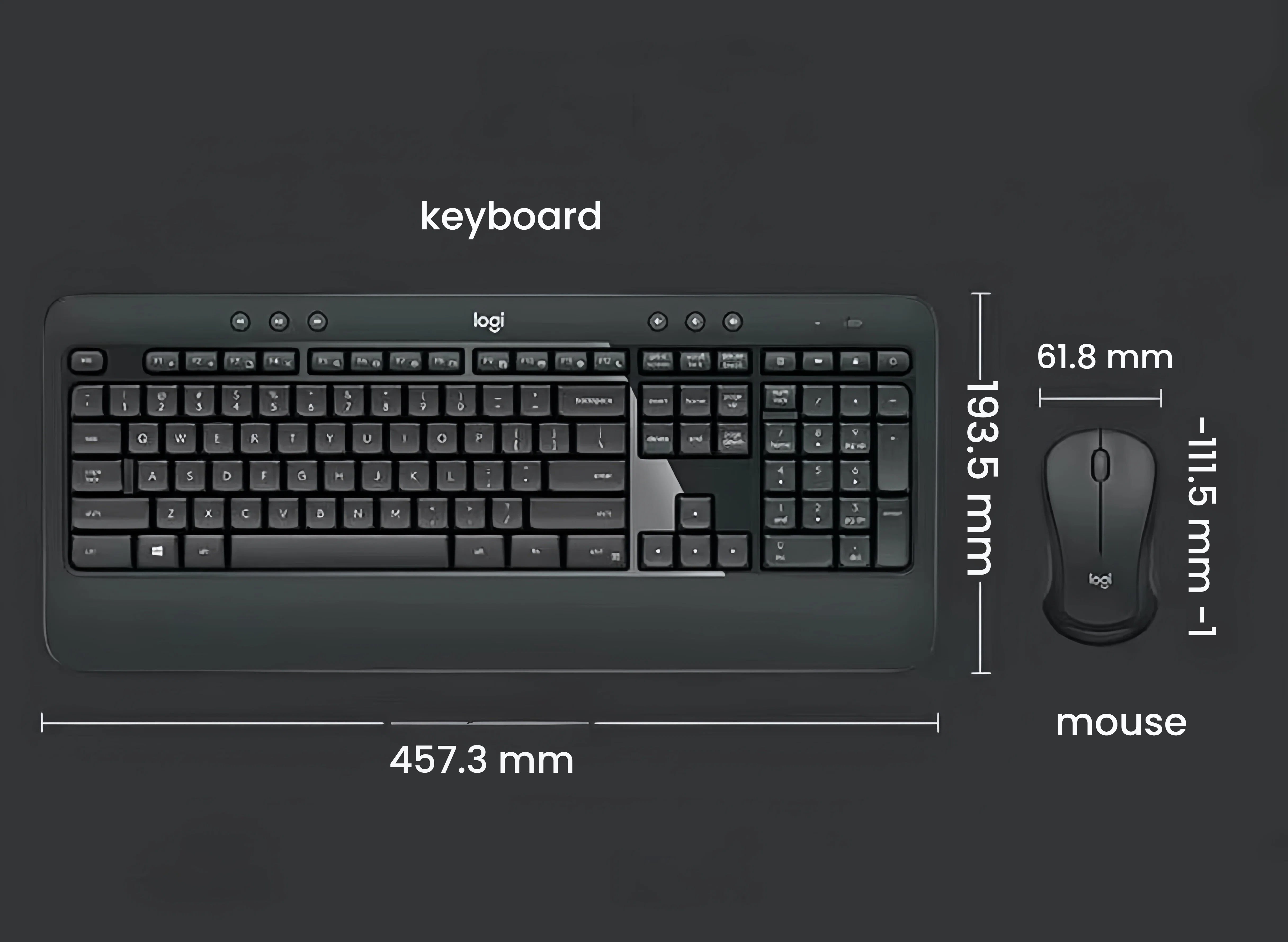 • Full-size keyboard with comfortable typing layout — The MK540 keyboard features a standard layout, full number pad, and deep-profile keys for a familiar typing experience. The keys are whisper-quiet and designed for long typing sessions.